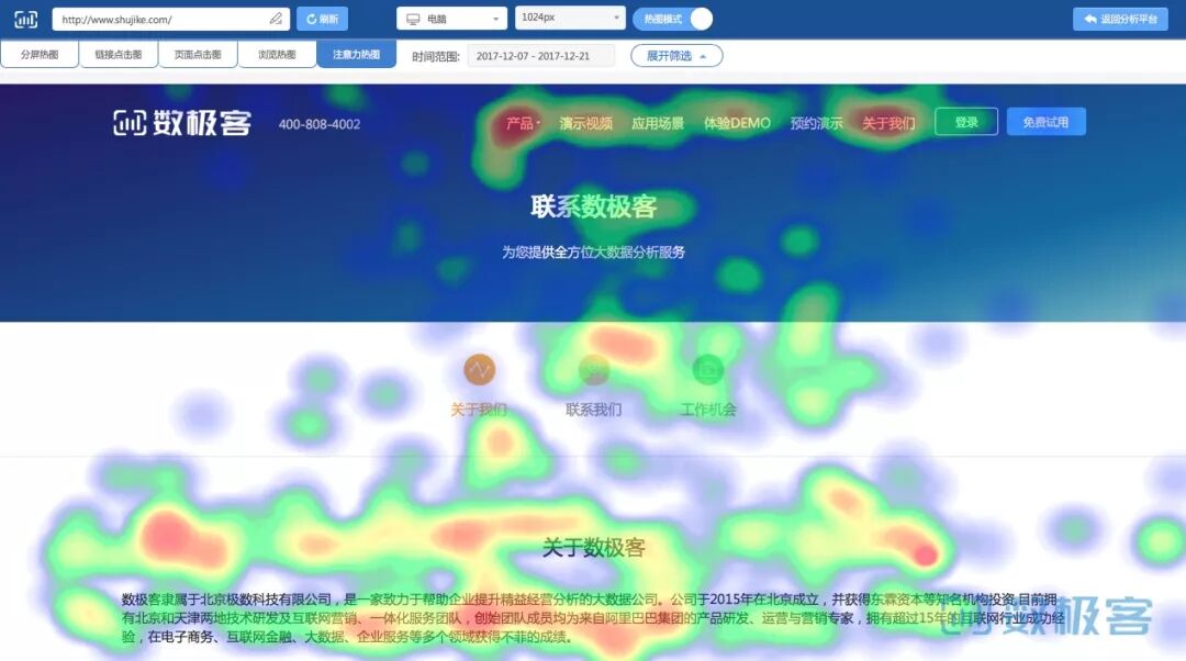 业务数据可以可视化,那么行为数据如何可视化呢? 数极客把上述行为转化成了分屏触达率热图、链接点击图、页面点击图、浏览热图、注意力热图这5种热图,通过5种热图的交叉分析,可以有效的分析出用户最关注的内容。