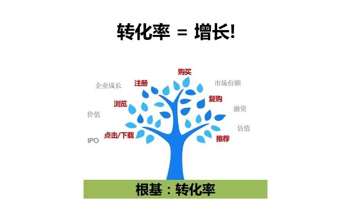 转化率是完成转化目标的用户占总体用户的比例,注册、下单、登录、复购,都可以用转化率进行量化,转化率是互联网平台的增长的基石。高增长的平台基本也是高转化率的平台,而增长水平影响了企业的市场占有率和价值,对于在企业中工作的从业人员来说,高增长的企业也会更快促进个人的成长,获得更丰厚的回报。
