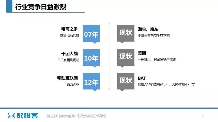 根据CNNIC统计报告显示:2006年 网民增长率为23.4%,2015年网民增长率为 6.1%,并且持续在下降。而在增量流量减少的同时,流量集中度在显著提高,以BAT为核心的大型互联网平台占据了行业内80%的流量。 每次互联网应用浪潮来临时,全国都有数千家同类平台进行竞争,经过3-5年竞争落幕时,仅剩下排名前3的平台脱颖而出,惨烈程度可想而知。