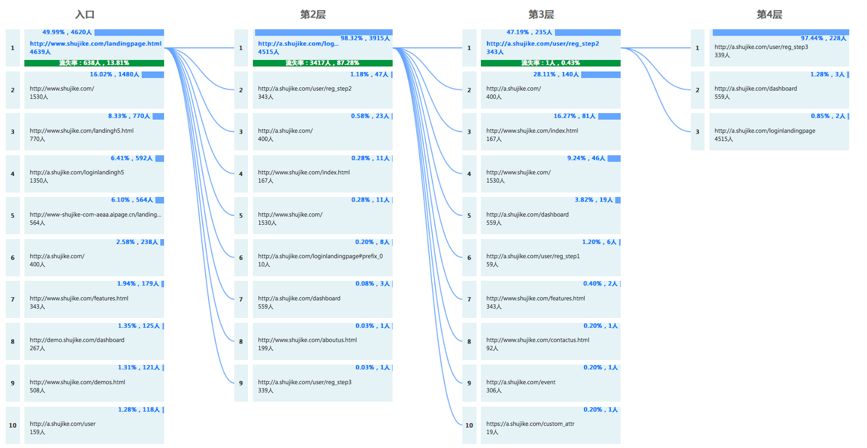 以往我们会通过产品和运营的经验去构建漏斗,但这个漏斗是否具有代表性,优化这个漏斗对于整体转化率的提升有多大作用,心里没有底气,这时我们可以通过用户流向分析去了解用户的主流路径。