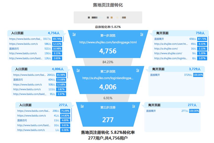 一般的转化漏斗只有主干流程,而没有每个步骤流入流出的详细信息,当我们在分析用户注册转化时,如果能知道没有转化到下一步的用户去了哪,我们就能更有效的规划好用户的转化路径。例如下图中的转化路径,没有进入第二步的用户,有88%是直接离开了,而还有10%的用户是注册用户选择直接登录,只有2%的用户绕过了落地页去网站首页了; 而没有从第二步转化至第三步的用户100%都离开了。这是比较典型的封闭式落地页,因此只需要优化第三步的转化率即可提升整体转化率。