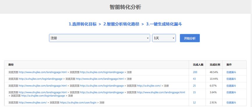 用户流向分析,非常直观,但需要分析人员有一定的经验和判断能力。为了解决这个问题,数极客研发了智能路径分析功能,只需要选择转化目标后,一键就能分析出用户转化的主流路径。将创建漏斗的效率缩短到了几秒钟。