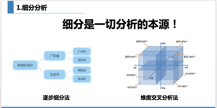细分分析是一切分析方法的本源,因为单一维度下的指标数据的信息价值很低,细分几乎帮助我们解决所有问题。比如转化漏斗,实际上就是把转化过程按照步骤进行细分。所谓下钻,就是在分析指标的变化时,按一定的维度不断的分解。比如,按地区维度,从大区到省份,从省份到城市,从省市到区。所谓上卷就是反过来。随着维度的下钻和上卷,数据会不断细分和汇总,在这个过程中,我们往往能找到问题的根源。