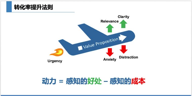 转化率提升的过程就像飞机起飞的过程一样,动力就是用户感知的好处(动机)减去感知的成本(行为难度),而良好的用户体验(触发机制)能让转化率提升更快。 我们所有的分析方法都是为了优化这个等式:提升体验、降低门槛。
