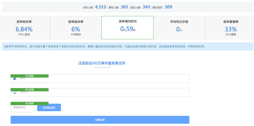 例如:填写表单所花费的时长,填写但没有提交表单的用户在填哪个字段时流失,表单字段空白率等表单填写行为。