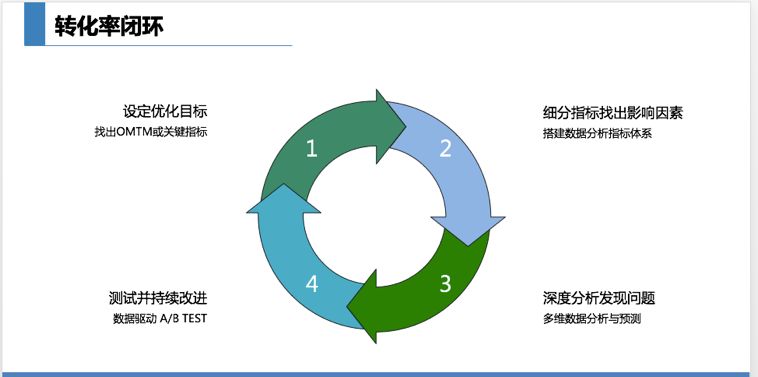 转化率的提升是一个持续和长期的过程,在某个阶段通过数据分析和优化方法提升指标,但经过一段时间后,因为环境的变化、用户习惯的变化等各种原因,有些方法和措施需要进行调整才能持续保持高转化率。因此我们需要掌握转化率提升的闭环,持续进行改进。