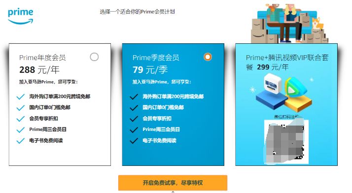 亚马逊中国官网上Prime分为三类:年度会员、季度会员、Prime+腾讯视频VIP联合套餐。