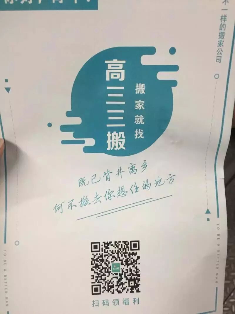 你看他的文案: 你好,青年 不一样的搬家公司 搬家,就找高三三班 既已背井离乡,何不搬去你想住的地方 扫码领福利 以上这些文案几乎都是失败的! 不一样的搬家公司 ——这是一句废话 既已背井离乡…… ——这跟你搬家公司有什么关系?搬去哪里,你能提供吗? 扫码领福利 ——这个套路太明显了,就不能直接把福利说出来嘛? 重要的事情说一遍: 任何没有知名度的品牌,不要写空虚、文艺、价值吸引不明确的文案! 去了解一下USP理论,提出你不一样的地方是什么? 是搬家快? 是搬家便宜? 还是搬家服务好? 请明确的告知与我! 不要让我云里雾里的!