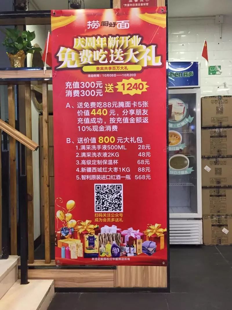 所以,即使亏也不会亏太多,而只要八个人进店,有一个人点了其他的菜品,就不会亏了。 这是引客的环节,剩下还有锁客的环节。就是充值300元,送价值1240元的东西。 虽然看似很吸引人,但是办卡的人不多,一个是因为看似可以获得1240元,但实际上,这些赠品成本很低,消费者现在又不傻,另外一个是因为300元成本太高了。 如果是我操作,我会把免费吃面改为1元吃面,然后面条可以提供好一点的(至少加肉沫),否则给人感觉免费的东西都是很差劲的印象;