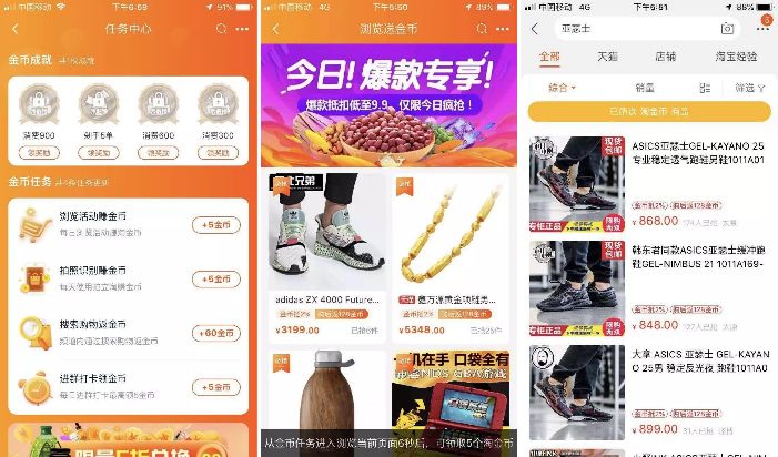 以淘金币为例,设置用户的积分获取方式围绕这用户完成购买的整个链路,从浏览产品到搜索购物,来刺激用户不断的转化。