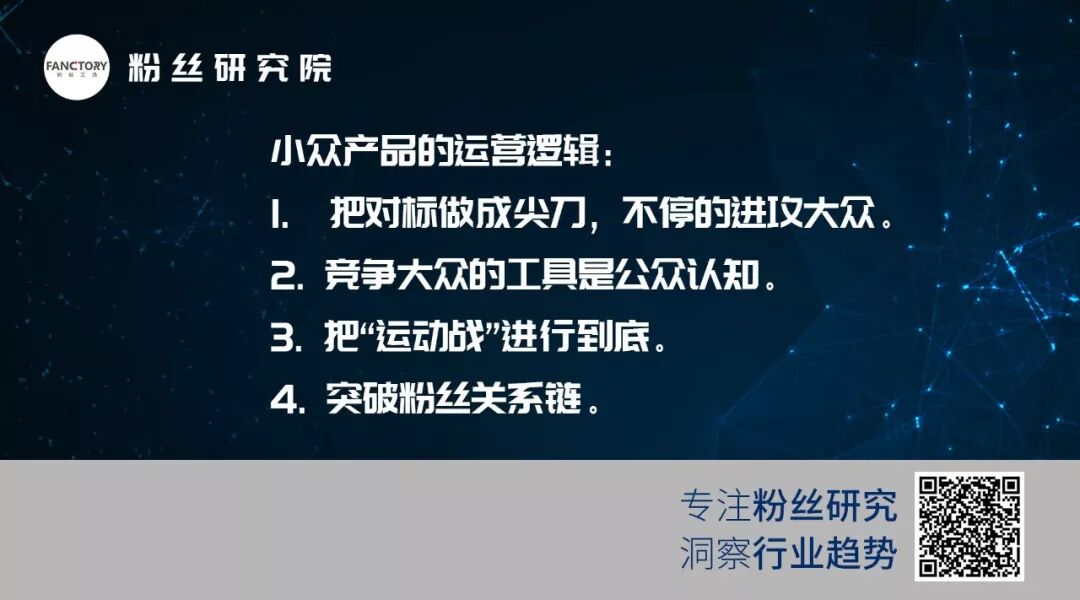 其次是要不停地进攻大众。如果不能进攻大众,我们的关注度就很低,所以进攻大众,找到对标,是小众产品成功的第一步。