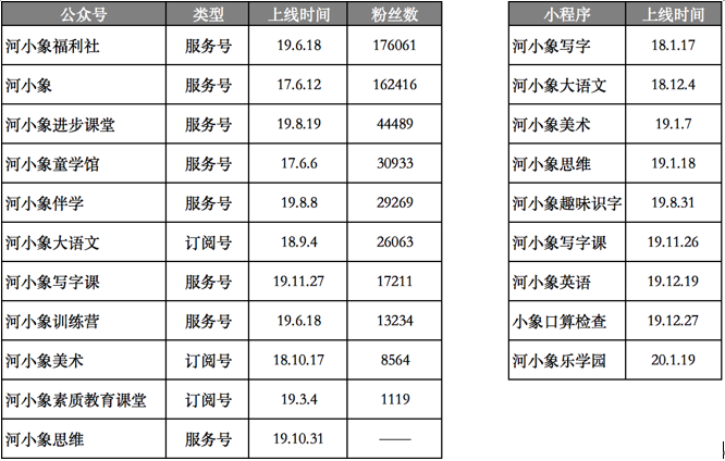 『河小象』是一家专注于3-12岁少儿素质教育,以“为孩子提供有效、有趣的普惠教育”为使命的互联网公司。在17年以『写字』产品切入市场,当时练字主要是采用线下教学的方式进行,河小象通过图像识别、语音评测、智能匹配等互联网技术手段,与著名书法家龚金夫合作推出明星产品『河小象写字课』,逐渐走向大众所熟知。19年8月,河小象宣布获得“创新工场”、“BAI”(贝塔斯曼亚洲投资基金)和好未来教育投资基金等2亿元融资,这让其成为少儿在线素质教育的头部玩家。同时公司的业务,也由最初的『写字课』,发展成『大语文』,目前又提出『以语文为核心的素质教育』,新增了美术、编程等品类。