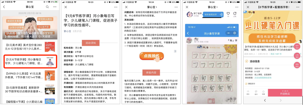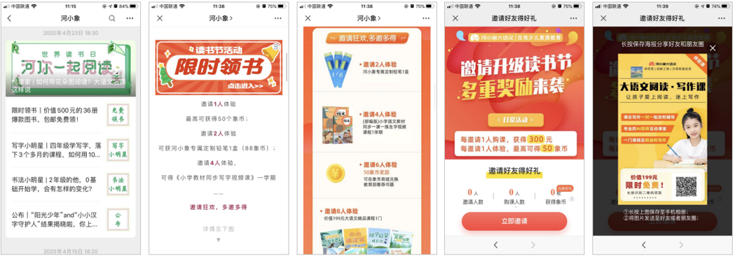 关于这些的玩法可更多的参考学习电商品类,比如拼多多。但是需要衡量的是,避免给用户带来欺骗感,从而对公司活动及产品失去信任感。 针对比如写字、美术、手工等品类的教学,家长是比较有动力将孩子的作品展示在自己社交圈中。河小象初期就是以宝妈群、论坛和社区为核心,通过对好的作品进行展示,以及将学习前后的字进行对比,让父母体会到教学效果。也鼓励父母在产品以及社交圈中展示孩子的作品,从而形成一定的传播。