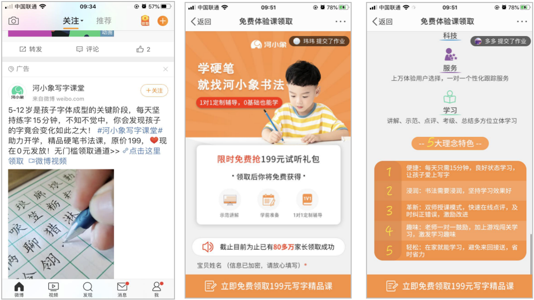 在写字课获得一定的市场验证之后,河小象也开始了大量的投放进行用户获取。 在投放渠道上,其以微信和微博为主。选择这两个平台可能的原因是:a. 因为河小象面对的是下沉市场,微信已经涵盖了这一目标用户,而微博也有下沉的趋势b. 具有一定的社交属性,写字这种比较容易晒成果的教学,能得到一定传播。