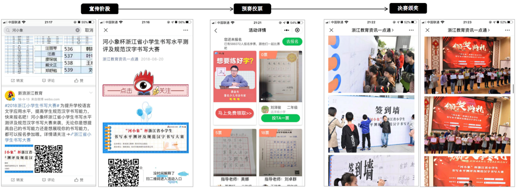 前面已经提到,龚金夫作为很多写字比赛的特约评委,河小象必然也会利用这一方式进行产品的宣传和用户的获取。目前已经举行过三个比较大型的书法比赛:18年9月:浙江省第一届河小象杯小学生书写水平测评及规范汉字书写大赛19年5月:浙江省第一届河小象杯小学生书写水平测评及规范汉字书写大赛很多将线下需求进行线上化的教育公司,可能都会采用举办线下比赛的方式进行曝光和用户获取。主要是因为这种面对面的方式有利于削弱对线上的不信任感,同时线下营销能更加精准接触到下沉市场人群。从浙江省第一届比赛效果来看,该比赛历时29天,参赛学校超过40所,参赛人数超过10000人。同时,在参赛环节的投票评比及转发中有超过400 000人参与。其具体的方式流程如下图:因该比赛的主办方为新浪浙江教育,河小象为承办方。故在前期宣传阶段,除了河小象在自己用户池中,如小学生书法测评中心等产品中进行活动曝光外,浙江教育相关公众号以及新浪号中均有宣传。同时应该有相关的校园线下推广,为活动的曝光和扩大影响面打下了一定基础。学生将自己的作品上传进行书法测评,由专业的书法老师进行点评并提供参赛指导。这一方式,让参赛的学生都能接受到河小象老师的指导,类似与体验了其提供的课程,为建立信任感和口碑的传播打下了基础。上传参赛作品并进行网络人气选手票选。在这个阶段中,选手将自己的作品上传到“小学生书法测评中心”小程序中。为了进行拉票需要将小程序或者宣传海报转发到群及朋友圈中,这样为河小象的进一步曝光和扩散起到了很大的作用。决赛采用的现场比拼的形式进行,在比赛的同时也有相关的讲座培训。这样一个面对面的沟通的机会,可以让家长能够更加直接的了解河小象品牌及其产品,进一步拉近了距离。